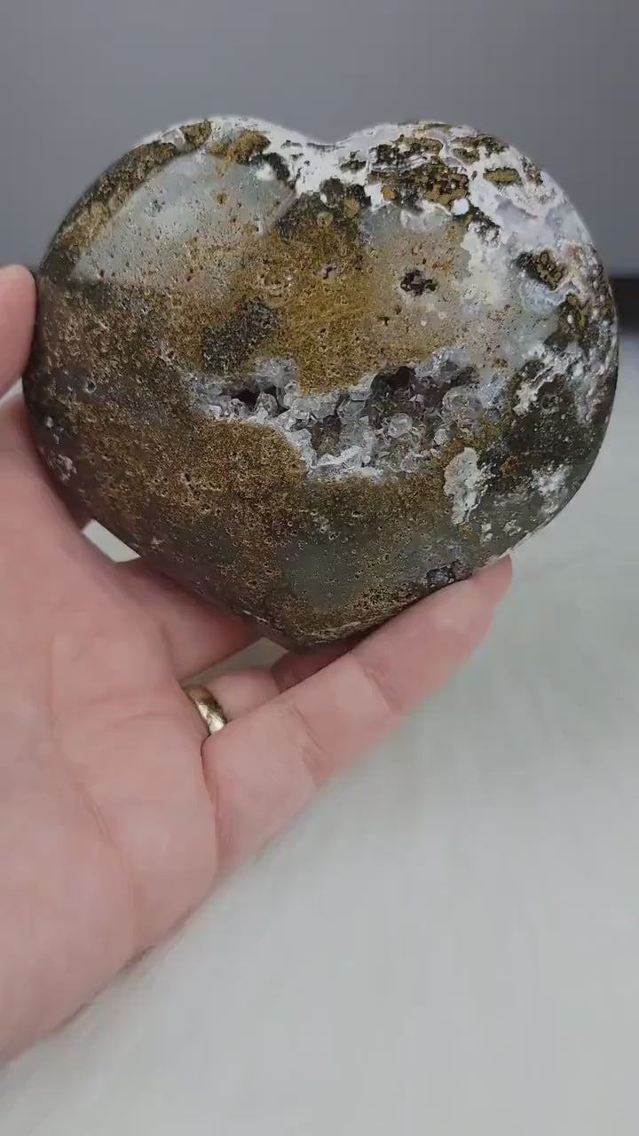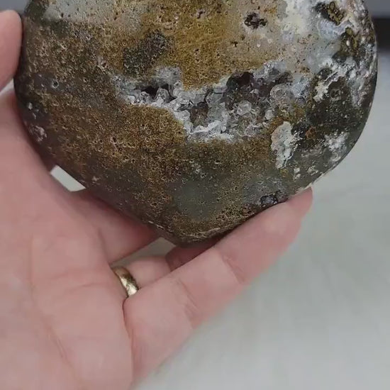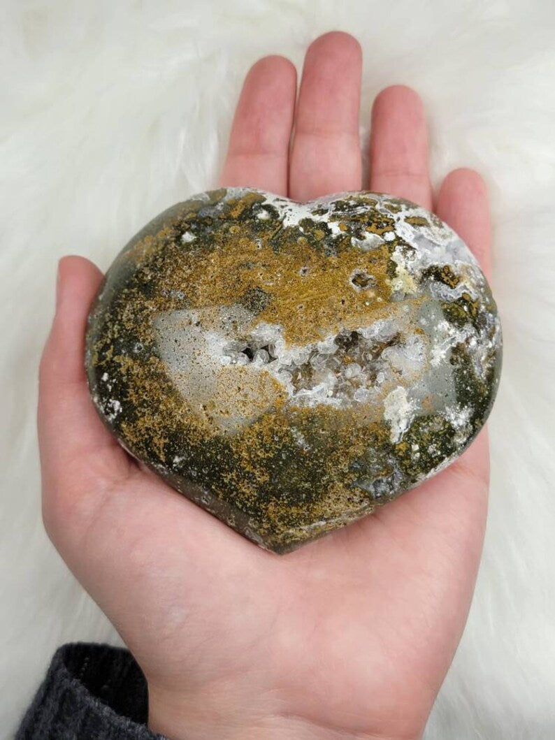 This heart is carved from Sea jasper and has a beautiful druzy opening in the center. It measures 3.4" x 1.75" x 3.8" and weighs 1lb.
